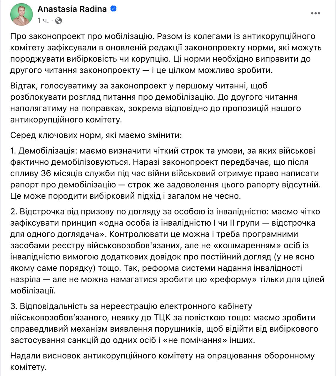Среди ключевых норм, которые комитет призывает изменить ко второму чтению, нардеп Анастасия Радина называет: