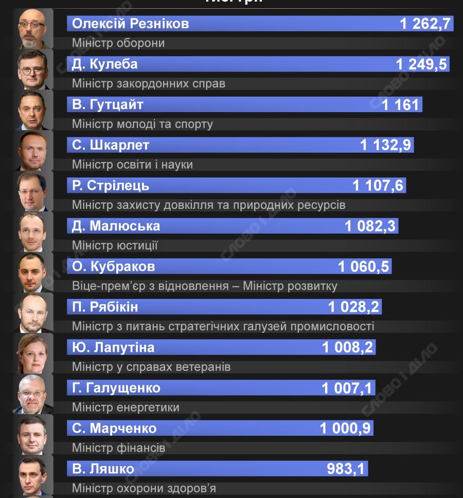 - министр иностранных дел Дмитрий Кулеба - 1 млн 249,5 тысяч гривен (против 1 млн 66,7 тысяч годом ранее);