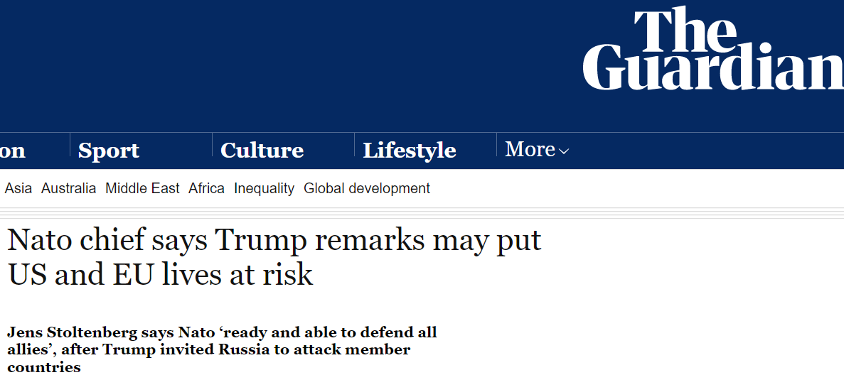 "Любое предположение о том, что союзники не будут защищать друг друга, подрывает всю нашу безопасность, включая безопасность США, и подвергает американских и европейских солдат повышенному риску", - заявил генеральный секретарь Североатлантического Альянса Йенс Столтенберг, слова которого цитируют западные СМИ, в частности, британская газета The Guardian.