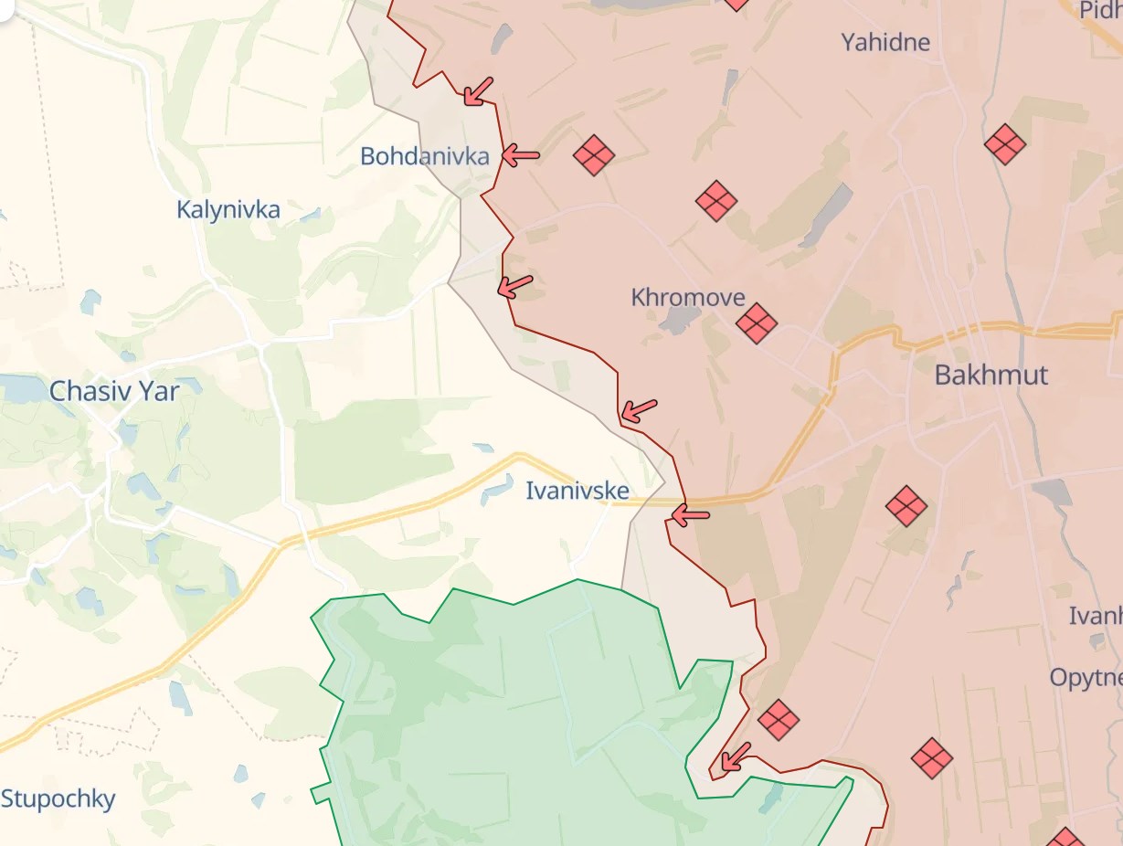 Украинские паблики зафиксировали продвижение российских войск и на Бахмутском направлении - у Ивановского (Красного). Все это расценивается как подготовка к вытеснению украинских войск на западный берег канала Северский Донец - Донбасс и подготовка к наступлению на Часов Яр.