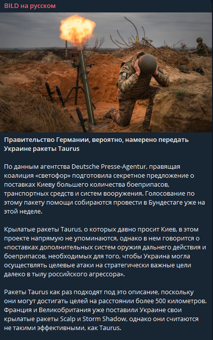 Также газета The New York Times сообщала, что на Германию оказывается давление с целью заставить ее поставить Украине ракеты большой дальности Taurus, тем более, что Великобритания и Франция уже предоставили Киеву аналогичное вооружение.