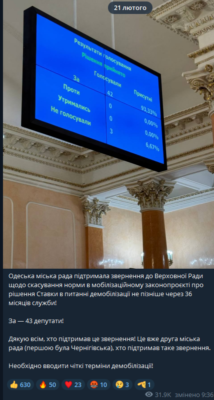 Одесский горсовет призывает Верховную Раду отменить норму о демобилизации через 36 месяцев по решению Ставки в законопроекте об ужесточении мобилизации. За такое обращение к парламенту проголосовали 43 местных депутата.