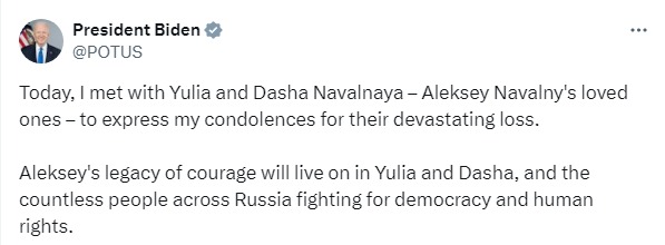"Сегодня я встретился с Юлией и Дашей Навальными – близкими Алексея Навального – чтобы выразить соболезнования в связи с их трагической потерей. Наследие мужества Алексея будет жить в Юлии и Даше, а также в бесчисленном количестве людей по всей России, борющихся за демократию и права человека", – написал Байден.