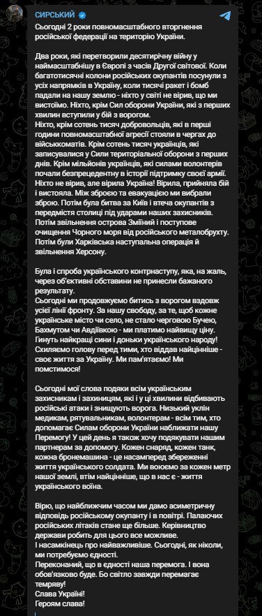 Главком Александр Сырский написал пост, посвященный двухлетию российского вторжения.