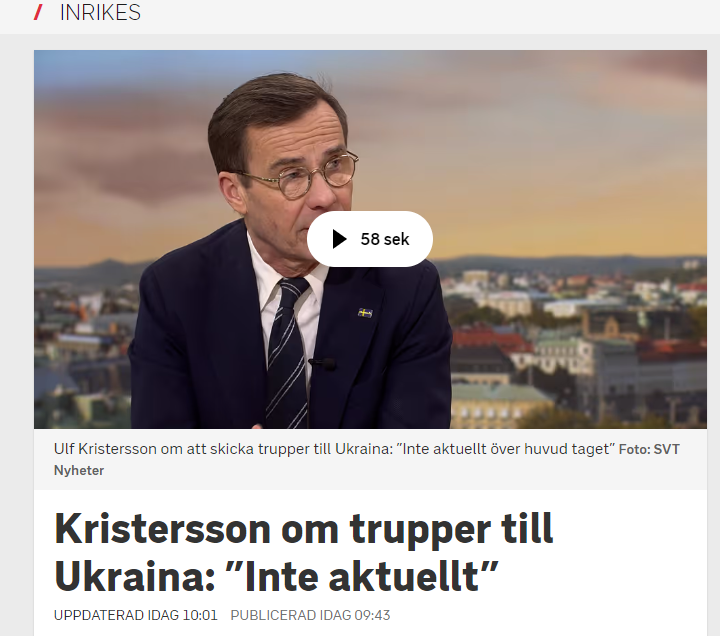 Во вторник, 27 февраля, премьер-министр Швеции Ульф Кристерссон дал понять, что не намерен отправлять войска в Украину, о возможности чего ранее заявил президент Франции Эммануэль Макрон.