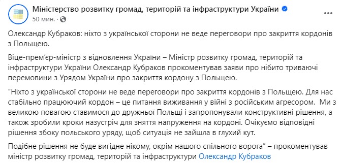 "Никто с украинской стороны не ведет переговоры о закрытии границ с Польшей. Для нас стабильно работающая граница – это вопрос выживания в войне", – сказал вице-премьер.