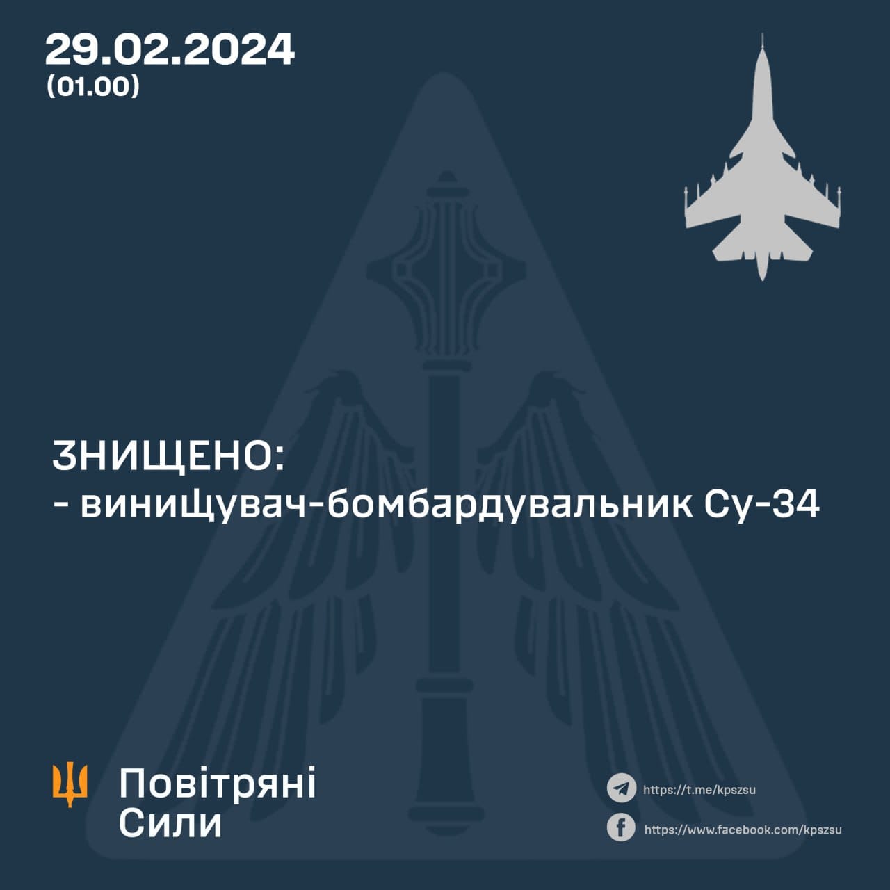 "Сегодня, 29 февраля, - дата, которая выпадает раз в четыре года, но уже привычный для россиян день с потерей очередного самолета. Минус Су-34 на Восточном направлении", - заявил Олещук.