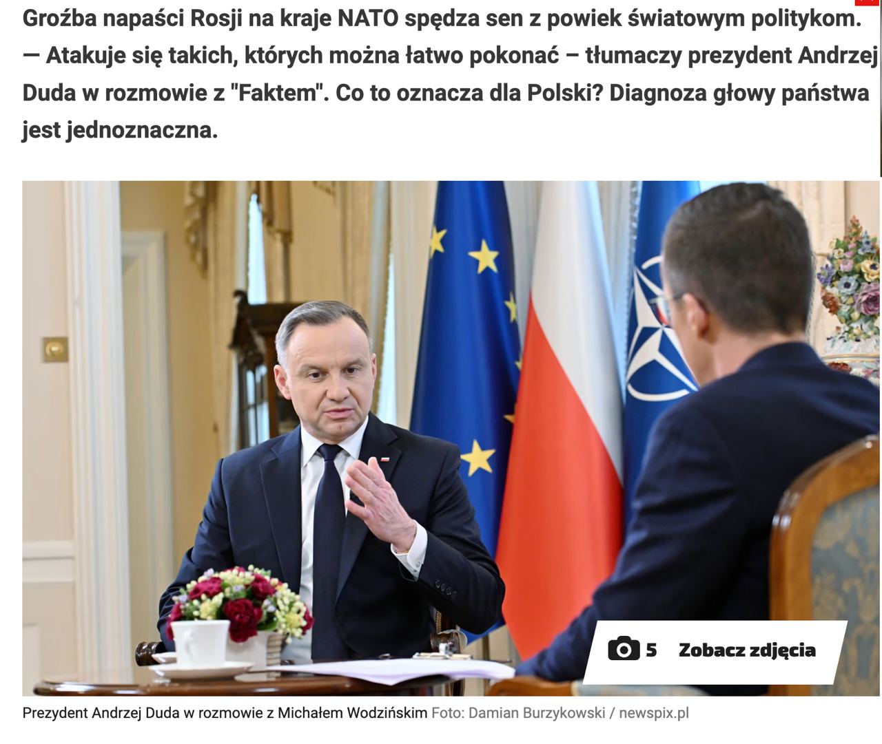 Президент Польши Анджей Дуда не верит в нападение РФ на страны НАТО, потому что убежден, что они успеют к этому подготовиться.