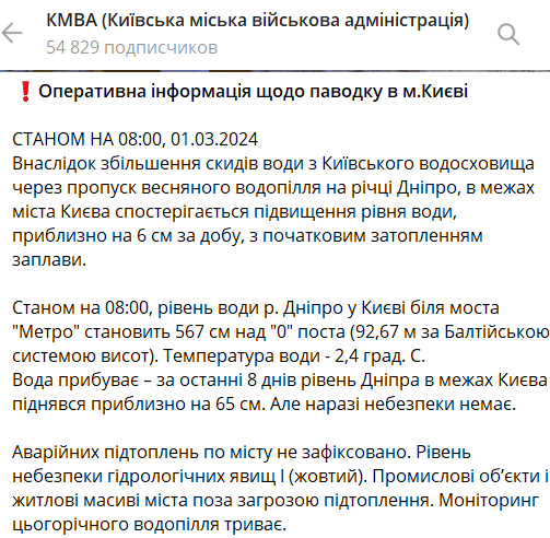 "По состоянию на 08:00 уровень воды г. Днепр в Киеве у моста "Метро" составляет 567 см над "0" поста (92,67 м по Балтийской системе высот). Температура воды – 2,4 градусов. Вода прибывает – за последние 8 дней уровень Днепра в пределах Киева поднялся примерно на 65 см. Но опасности нет. Аварийные подтопления по городу не зафиксированы. Уровень опасности гидрологических явлений I (желтый). Промышленные объекты и жилые массивы города вне угрозы подтопления. Мониторинг нынешнего половодья продолжается", - говорится в сообщении.