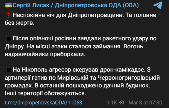 08:00 Сегодня ночью российские войска нанесли ракетный удар по Днепру. На месте атаки начался пожар. Об этом сообщил глава Днепропетровской ОВА Сергей Лысак.