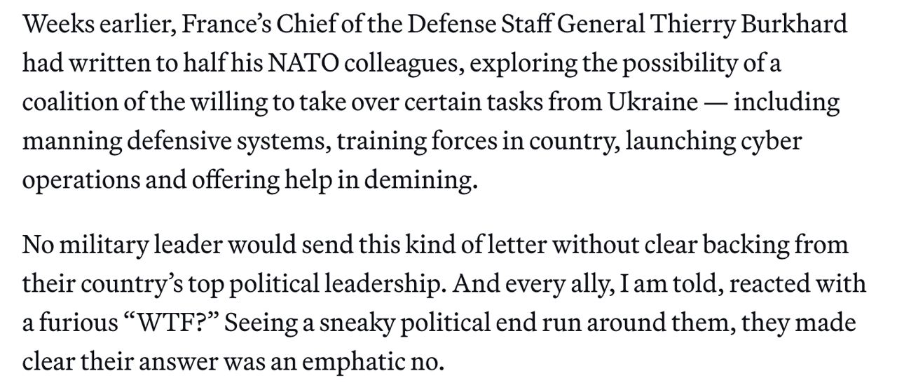 11.22 Начальник штаба обороны Франции Тьерри Буркхард несколько недель назад написал коллегам по НАТО с вопросом о возможности отправки иностранных военных в Украину для выполнения ряда задач, утверждает бывший постпред США при НАТО Иво Даалдер в статье для Politico.