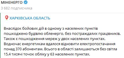 "В результате боевых действий в одном из населенных пунктов повреждено здание облэнерго, без пострадавших работников. Также имеются повреждения сетей в двух населенных пунктах" - заявили они.