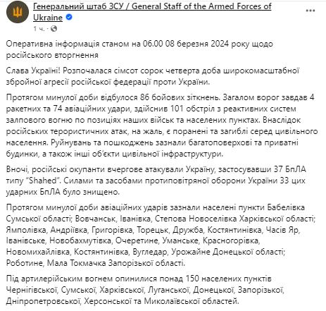 Утром 8 марта Генштаб ВСУ обнародовал сводку о ситуации на фронте за минувшие сутки.