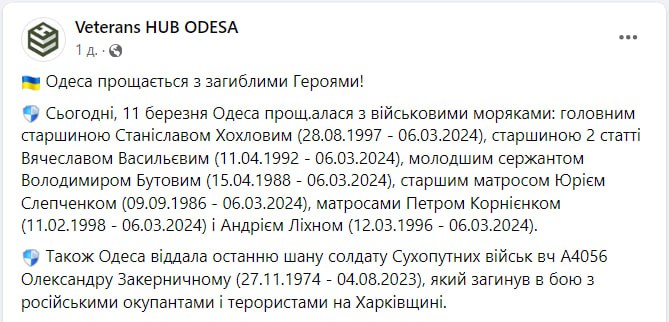 Причина гибели не указывается, но в списке есть Юрий Слепченко, который, как ранее сообщали в соцсетях, погиб во время российского удара по порту 6 марта, когда в Одессу приехал Зеленский.