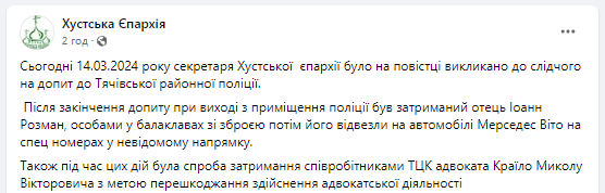 Как сказано в публикации в соцсети, отец Иоанн Розман был вызван по повестке на допрос в полицию. При выходе из участка Тячевской районной полиции его задержали "лица в балаклавах с оружием" и увезли на бусе "Мерседес Вито" со спецномерами "в неизвестном направлении".