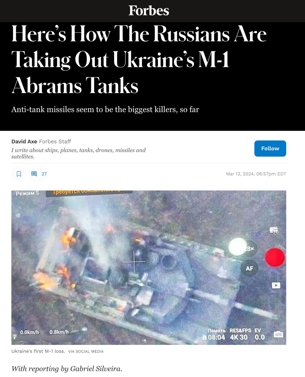 09.35 Forbes анализирует потерю первых трех американских танков Abrams в Украине и дает свою версию, как они были поражены.