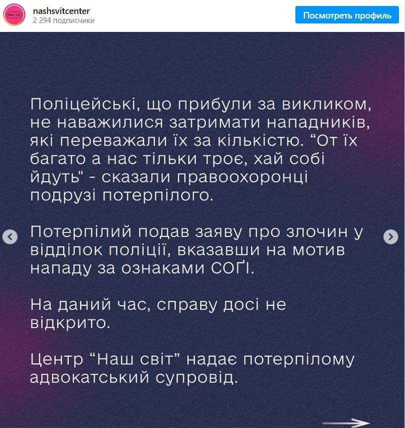 "Полицейские, которые прибыли по вызову, не решились задержать нападавших, которые превышали их числом. "Нас всего трое, а их - вон сколько. Пусть себе идут", - сказали правоохранители подруге потерпевшего", - пишет организация.
