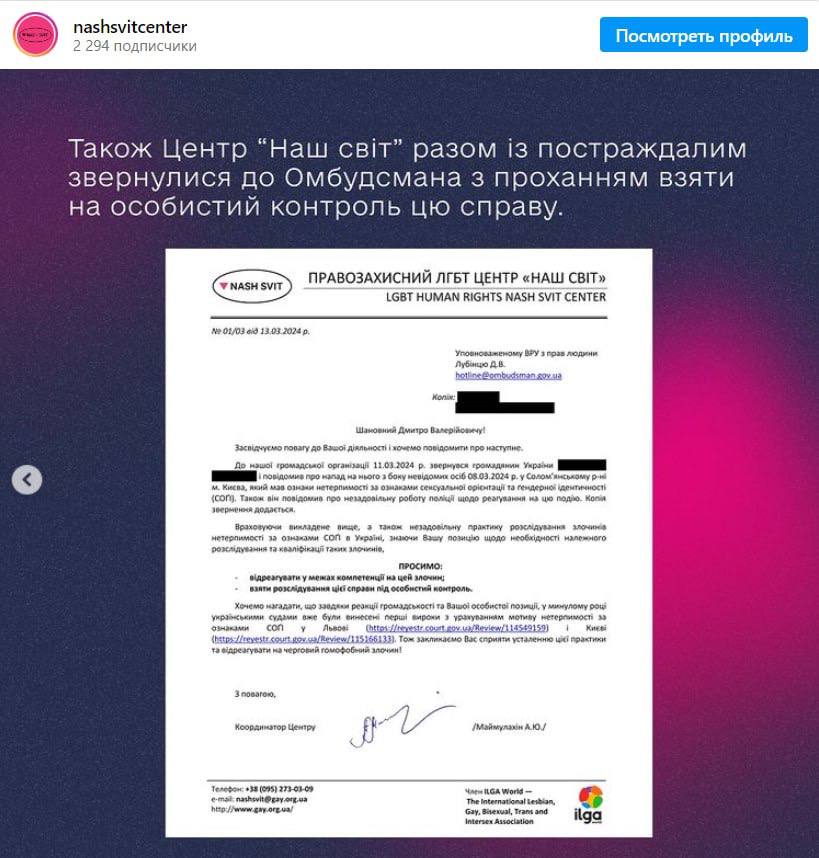 Об этом пишет правозащитная организация "ЛГБТ-центр "Наш мир".