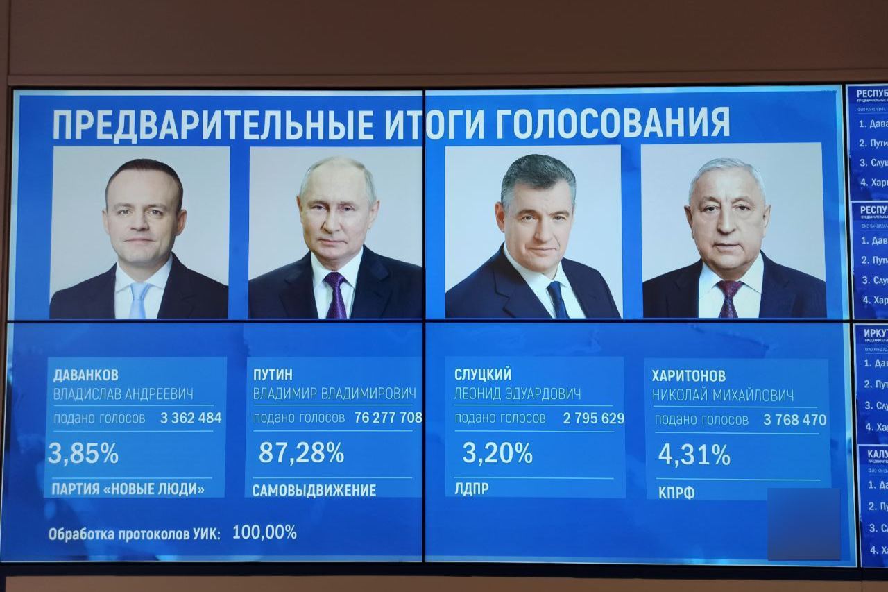 Согласно данным ЦИК РФ, Николай Харитонов набрал 4,31% голосов, Владислав Даванков - 3,85%, а Леонид Слуцкий - 3,20%.