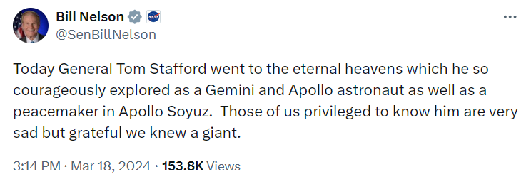 "Сегодня генерал Том Стаффорд отправился на вечные небеса, которые он так мужественно исследовал в качестве астронавта миссий "Джемини" и "Аполлон" и миротворца во время совместного полета "Союз-Аполлон", - написал Нельсон.
