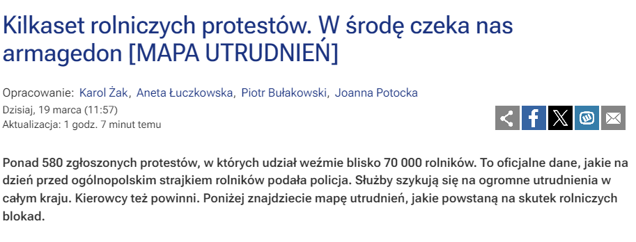 Ожидаются значительные проблемы на дорогах по всей Польше из-за всенародной забастовки фермеров, запланированной на завтра. Интернет-карта сельскохозяйственных блокад содержит более 500 точек, включая несколько на подъездных дорогах к Варшаве.