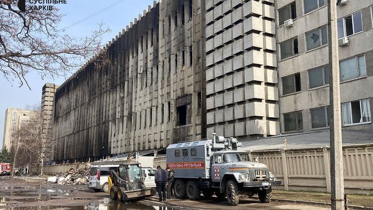 Утренние кадры с места вчерашнего прилёта по типографии в Харькове. Фото: суспильне