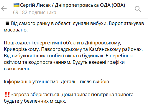 В свою очередь глава Днепропетровской областной военной администрации Сергей Лысак заявил, что повреждены энергетические объекты в Днепровском, Криворожском, Павлоградском и Каменском районах области.