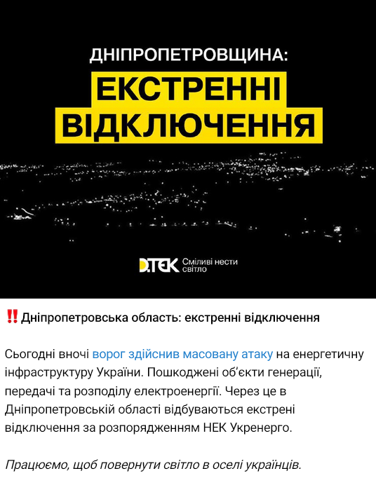 "Повреждены объекты генерации, передачи и распределения электроэнергии. Поэтому в Днепропетровской области происходят экстренные отключения по распоряжению НЭК Укрэнерго", - говорится в сообщении.