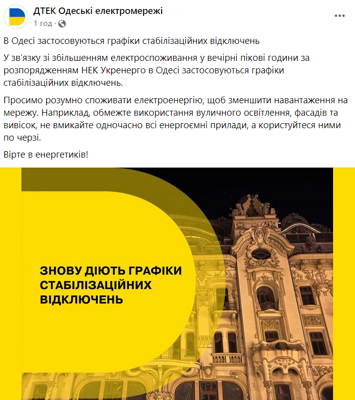 "В связи с увеличением электропотребления в вечерние пиковые часы по распоряжению НЭК "Укрэнерго" в Одессе применяются графики стабилизационных отключений. Просим разумно потреблять электроэнергию, чтобы снизить нагрузку на сеть", - говорится в сообщении.