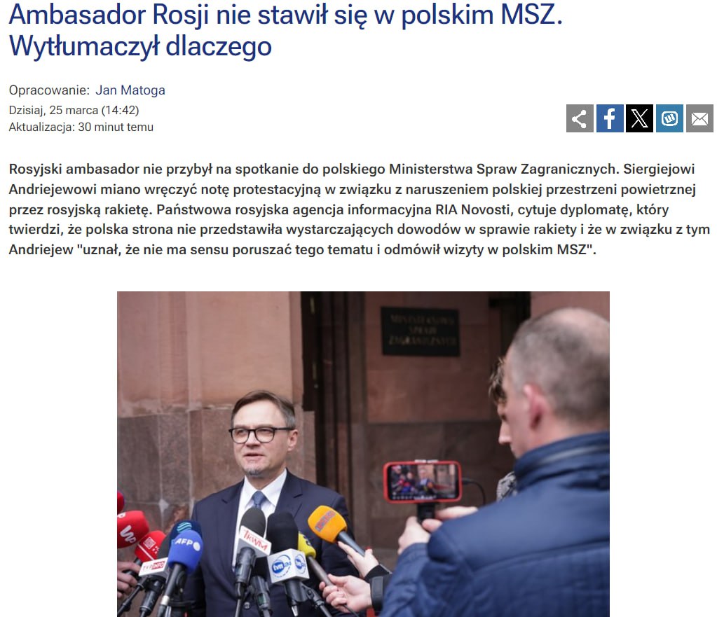 Напомним, 24 марта одна из российских ракет во время ночной атаки на западную Украину зашла на 39 секунд в воздушное пространство Польши около города Осердув.