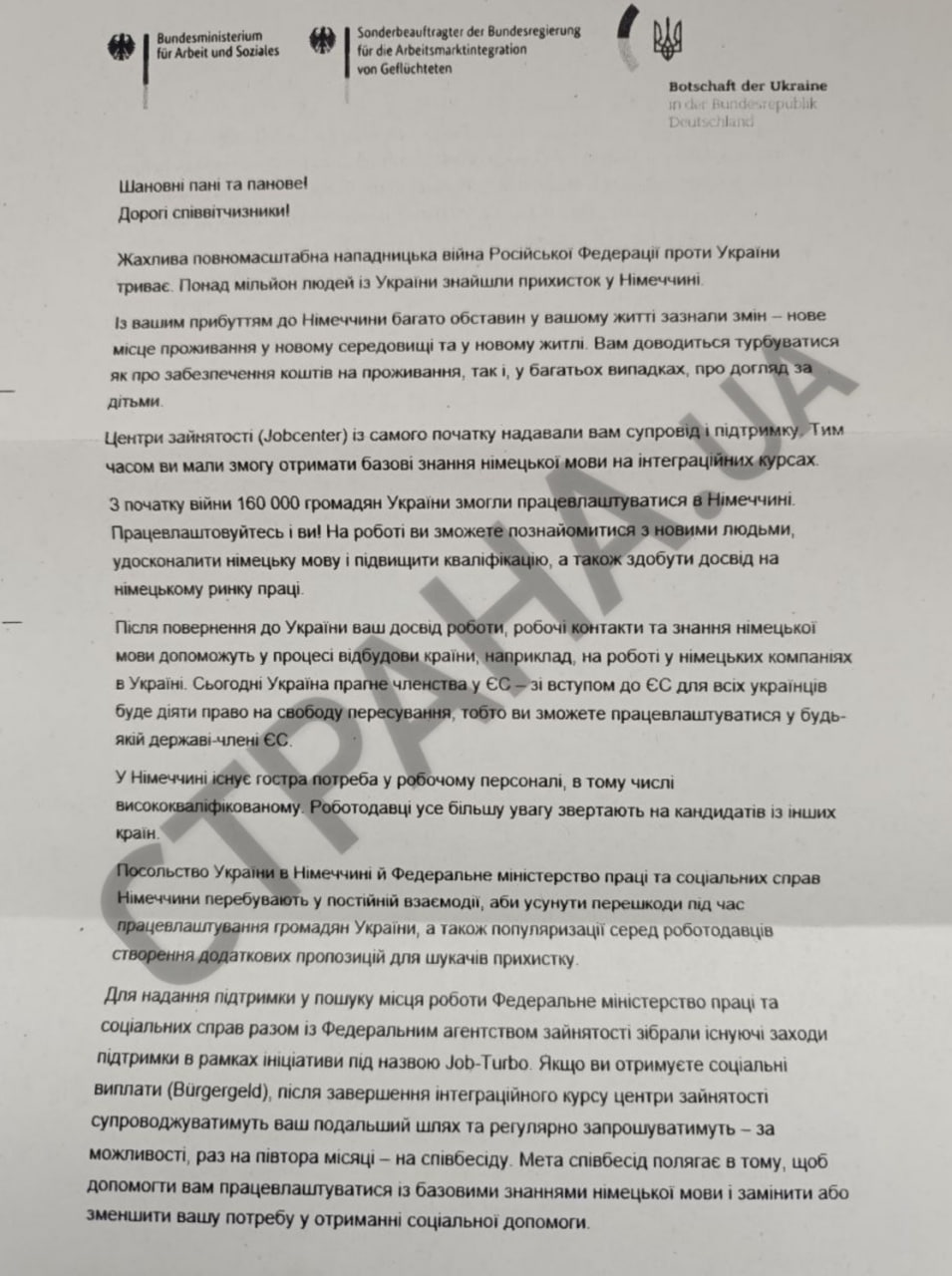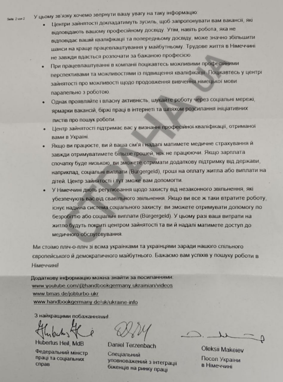 Такое письмо начало приходить домой к гражданам Украины, живущим в Германии. Помимо Макеева, его подписали немецкий министр труда Хубертус Хайль и уполномоченный по интеграции беженцев Даниэль Терценбах.
