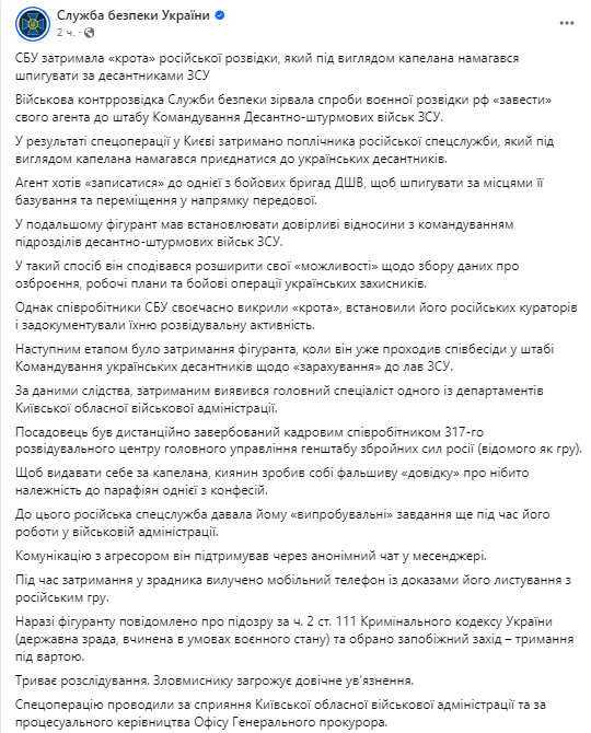 СБУ заявляет о задержании военного капеллана и по совместительству чиновника Киевской ОВА, подозреваемого в работе на РФ.