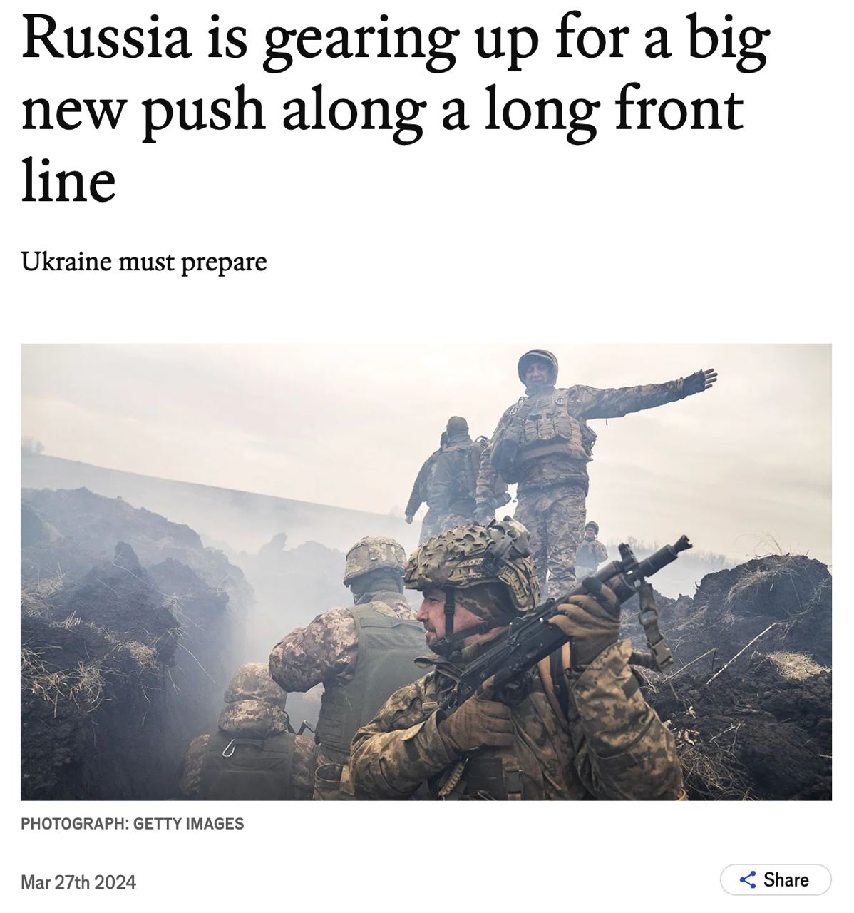 "И способность Украины сдержать его на выглядит сейчас гораздо менее уверенной, чем год назад. Вот почему ей срочно необходимо мобилизовать больше войск и построить более надежную линию обороны", - пишет издание.