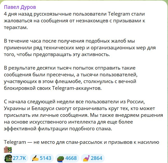 "Мы также внедряем решения на основе искусственного интеллекта для еще более эффективной фильтрации нежеланных сообщений", – добавил владелец Telegram.