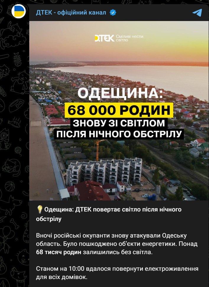 Более 68 тысяч домохозяйств остались без света, сообщает ДТЭК. К десяти утра им удалось вернуть электричество.