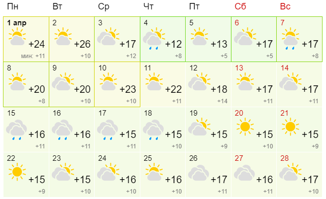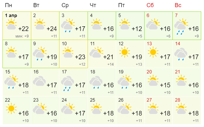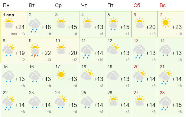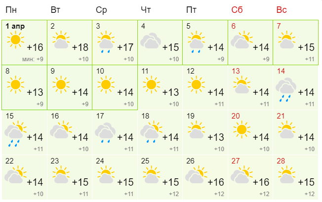 В Киеве апрель начнется с +26 градусов днем. Такое тепло продержится до 2 апреля. Затем похолодает +16, и эта дневная температура будет считаться среднемесячной. Заморозков уже не ожидается даже ночью. Дождь будет идти около десяти дней, но небольшой - ливней не прогнозируется.