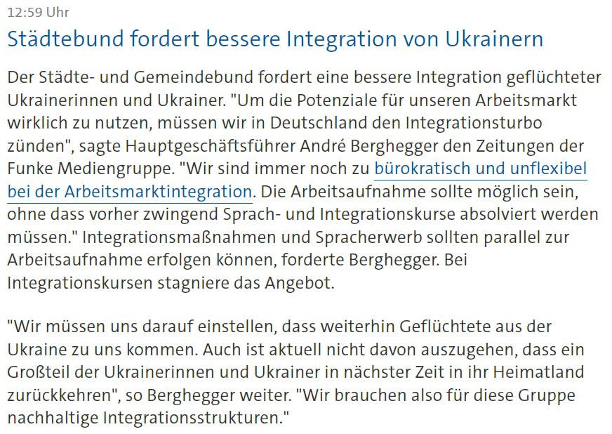 "Чтобы по-настоящему использовать потенциал нашего рынка труда, мы должны запустить интеграционный турбодвигатель в Германии. Мы все еще слишком бюрократичны и негибки, когда дело касается интеграции на рынке труда. Должна быть возможность начать работу без предварительного прохождения языковых и интеграционных курсов", - заявил управляющий директор Ассоциации городов и муниципалитетов Андре Берхеггер.