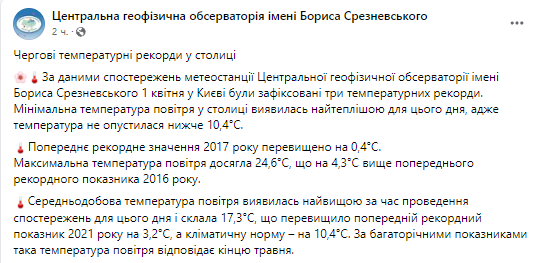 В понедельник, 1 апреля, в Киеве была зафиксирована минимальная и максимальная температура воздуха. Также поставили рекорд среднесуточной температуры воздуха.