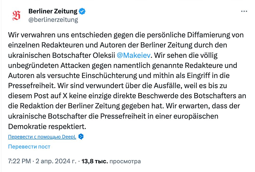 "Мы рассматриваем совершенно необоснованные нападки на названных редакторов и авторов как попытку запугивания и, следовательно, как посягательство на свободу прессы. Мы удивлены этими нападками, поскольку до этого сообщения на сайте X не было ни одной прямой жалобы от посла в адрес редакции Berliner Zeitung. Мы ожидаем, что украинский посол будет уважать свободу прессы в европейской демократии", - написал Х-аккаунт издания Berliner Zeitung.