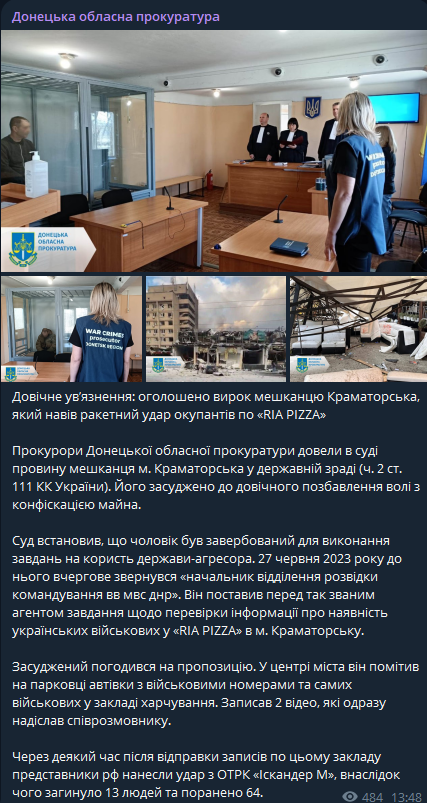 Житель Краматорска получил пожизненное заключение за наводку ракет на пиццерию "RIA PIZZA" летом прошлом года, где погибли 13 человек. Следствия установило, что мужчина работал на газотранспортном предприятии и был завербован Россией.