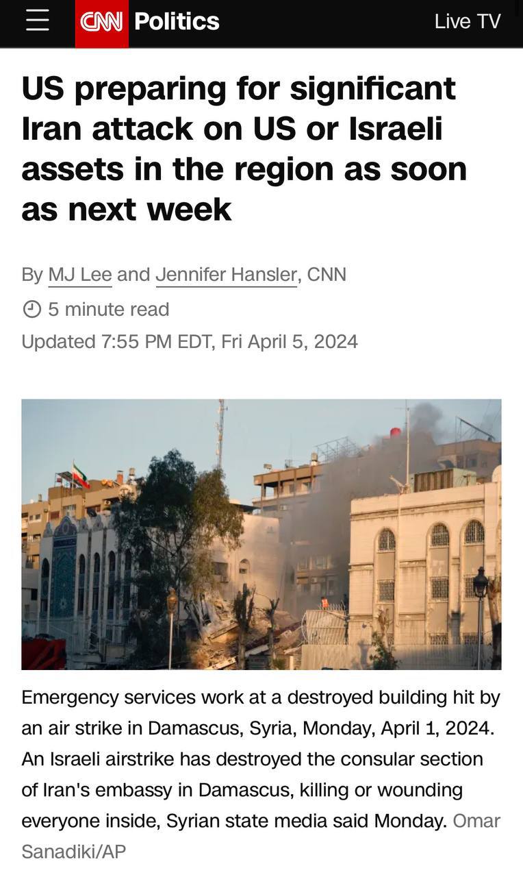 США и Израиль готовятся к "значительному" нападению Ирана на Израиль на следующей неделе. Атака может стать ответом на удар по иранскому консульству в Сирии.