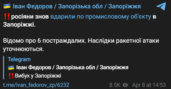 "Россияне снова ударили по промышленному объекту в Запорожье. Известно о шести пострадавших", - написал он.