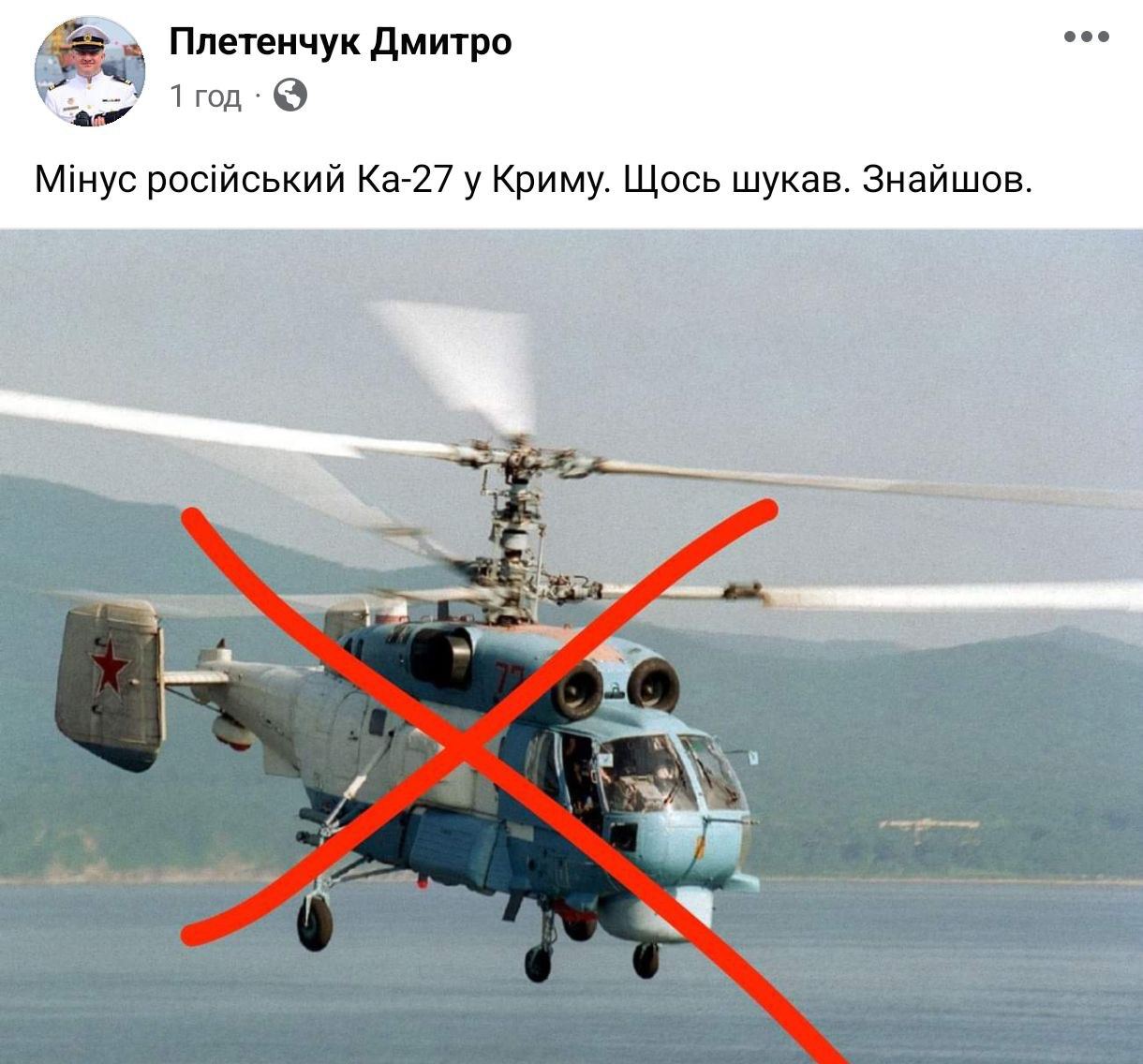 Спикер ВМС Украины Плетенчук заявил, что был взрыв вертолета в воздухе, но его причины пока не установлены.