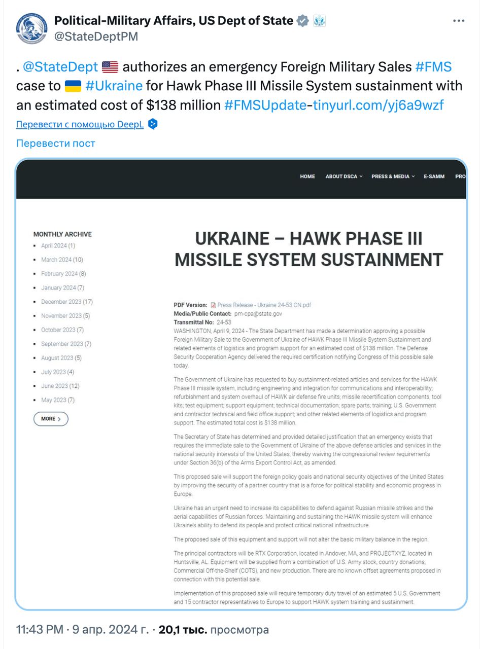 Госдепартамент одобрил экстренную продажу Украине средств ПВО на 138 млн долларов, сообщает ведомство.