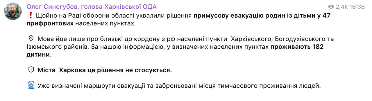 "В 47 прифронтовых населенных пунктах Харьковщины объявляем обязательную эвакуацию семей с детьми принудительно", - написал он.