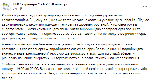 Национальная энергетическая компания "Укрэнерго" обратилась к потребителям с просьбой снизить потребление энергии вечером из-за значительных повреждений, нанесенных украинской энергетической системе в результате массированных атак противника.