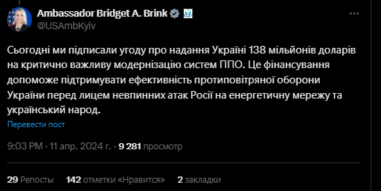 "Сегодня мы подписали соглашение о предоставлении Украине 138 млн долларов на критически важную модернизацию систем ПВО. Это финансирование поможет поддерживать эффективность противовоздушной обороны Украины перед лицом неустанных атак России на энергетическую сеть и украинский народ", - сообщила Бриджит Бринк.