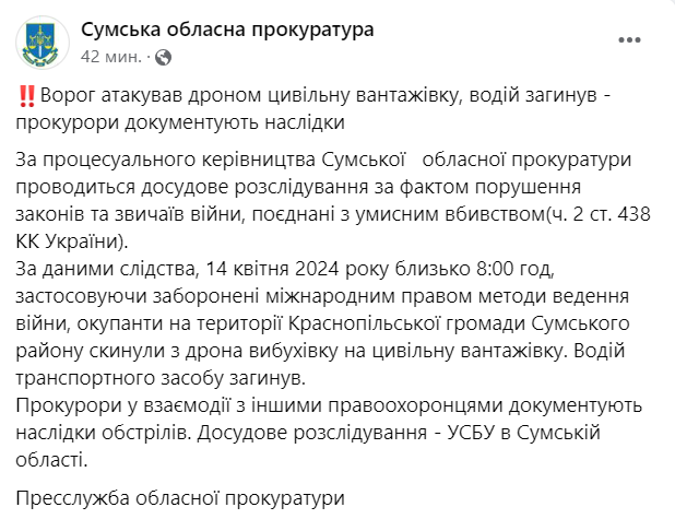 Сегодня утром российские войска сбросили с дрона взрывчатку на гражданский грузовик в Краснопольской громаде Сумской области. Водитель погиб.