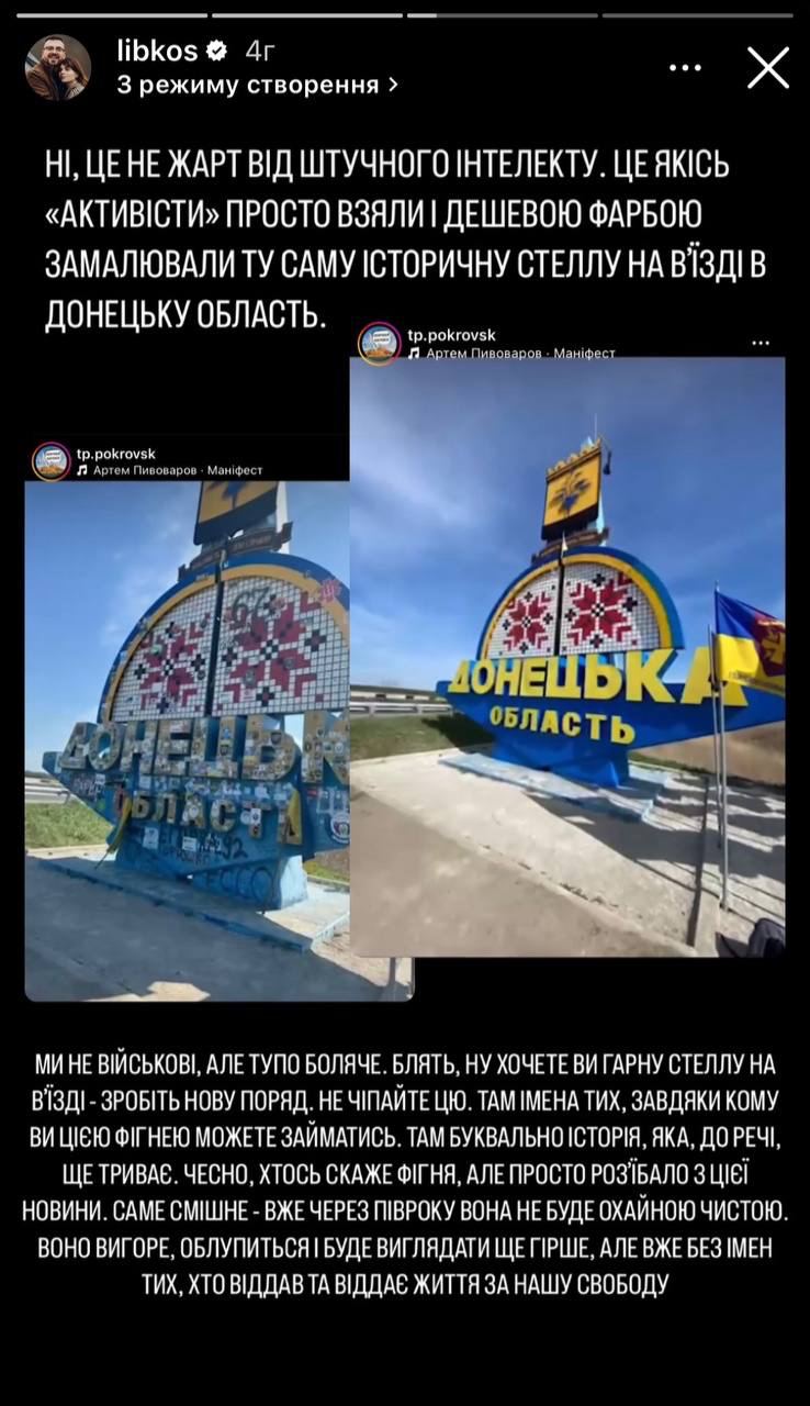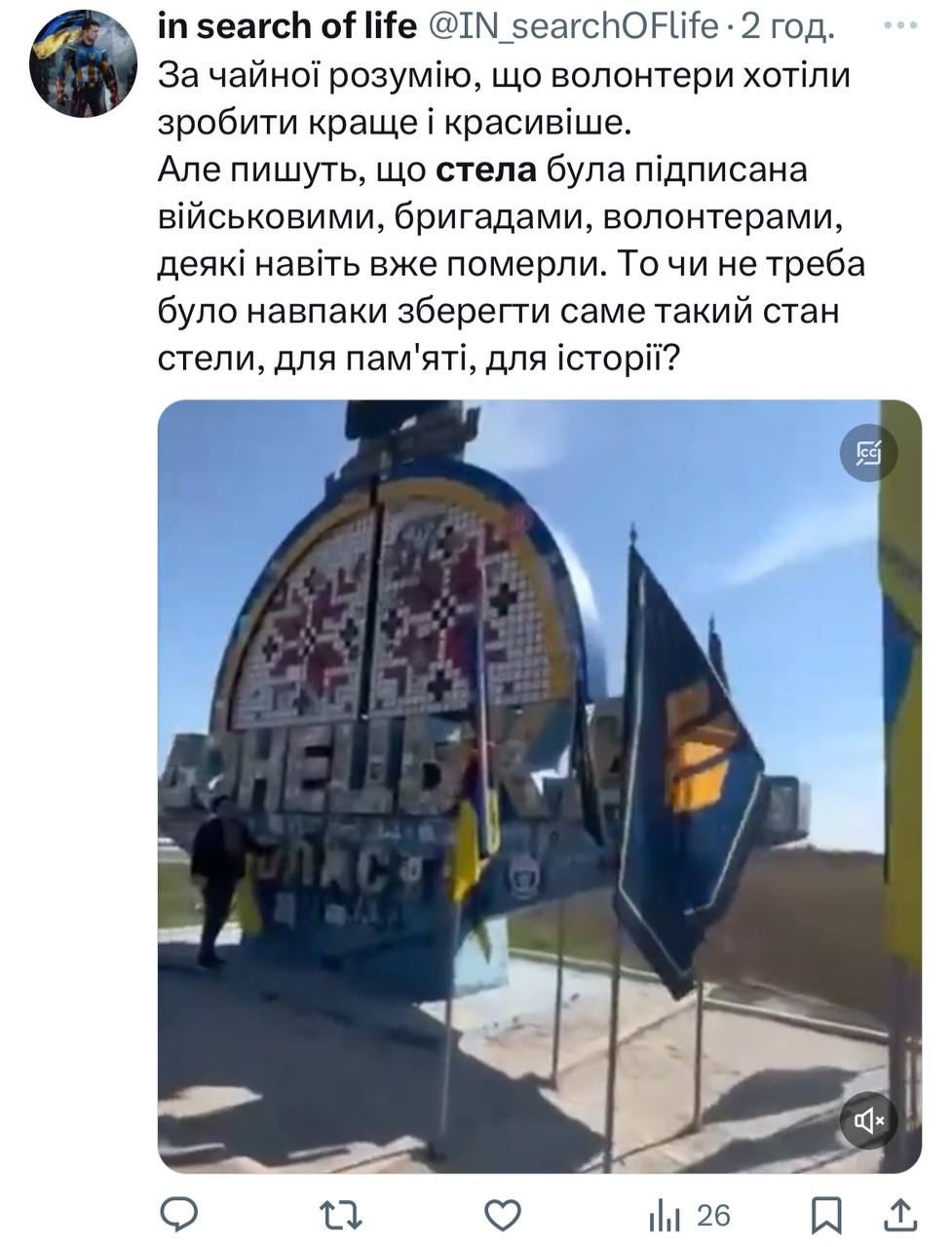 "Нет, это не шутка от искусственного интеллекта. Это какие-то "активисты" просто взяли и дешевой краской зарисовали ту самую историческую стелу на въезде в Донецкую область. Мы не военные, но тупо больно. Бл@ть, ну хотите вы красивую стелу на въезде - сделайте новую рядом. Не трогайте эту. Там имена тех, благодаря кому вы можете заниматься этой фигней."