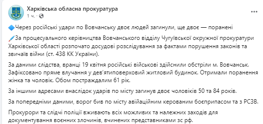 По данным следствия, утром 19 апреля российские военные совершили обстрел города Волчанск.
